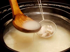 The porridge serves here are the result of cooking the rice until it start to break down, releasing its starches into the water. The colour of the water will have become milky, and the consistency should be that of a single cream. At Dao Xiang, the chef will only use the middle section of the boiled porridge starch water to serves to you. There are absolutely no seasoning at all in the porridge.