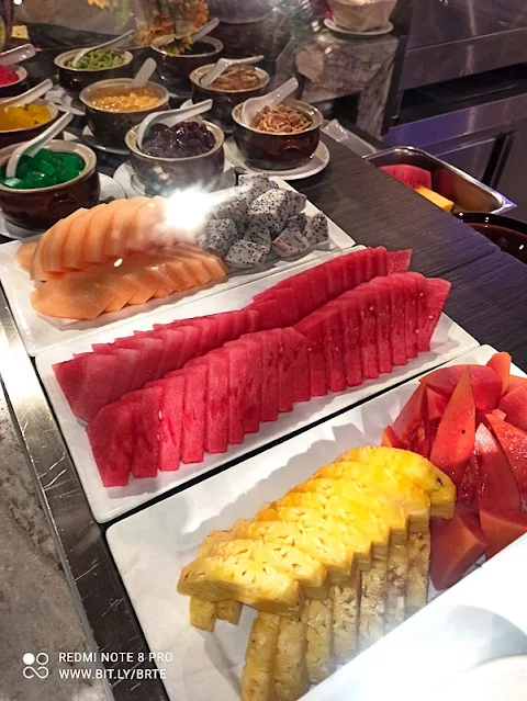 The fresh salad bar offers fresh ingredients including Western, Chinese and Malay, such as 6 types of salads: sausage, coleslaw, chilli, chicken ham, pasta, seafood and tuna; or pure salad;